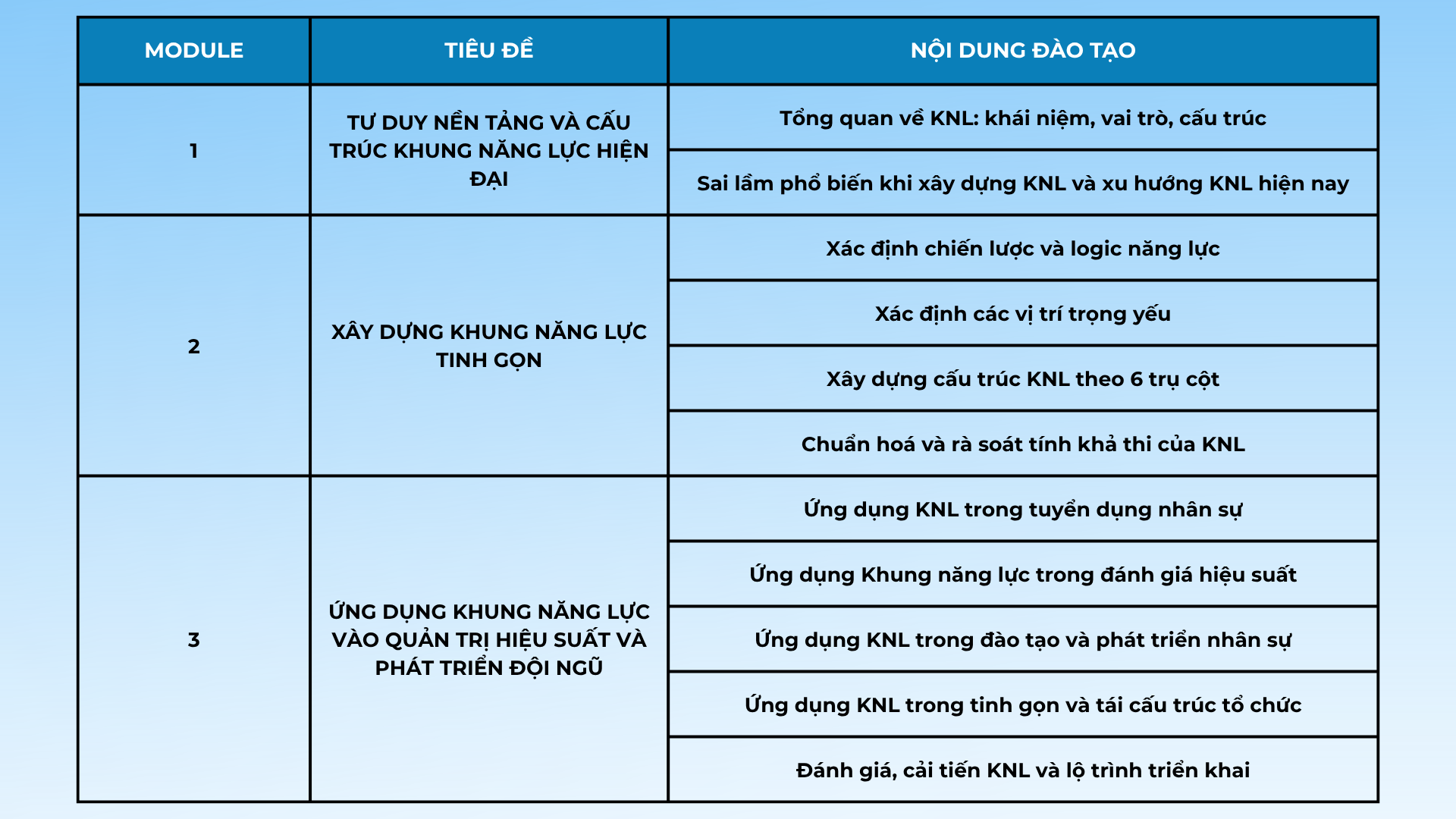 - Thời lượng chương trình đào tạo: 3 module tương đương 3 buổi đào tạo + 1 buổi coaching sau khoá học