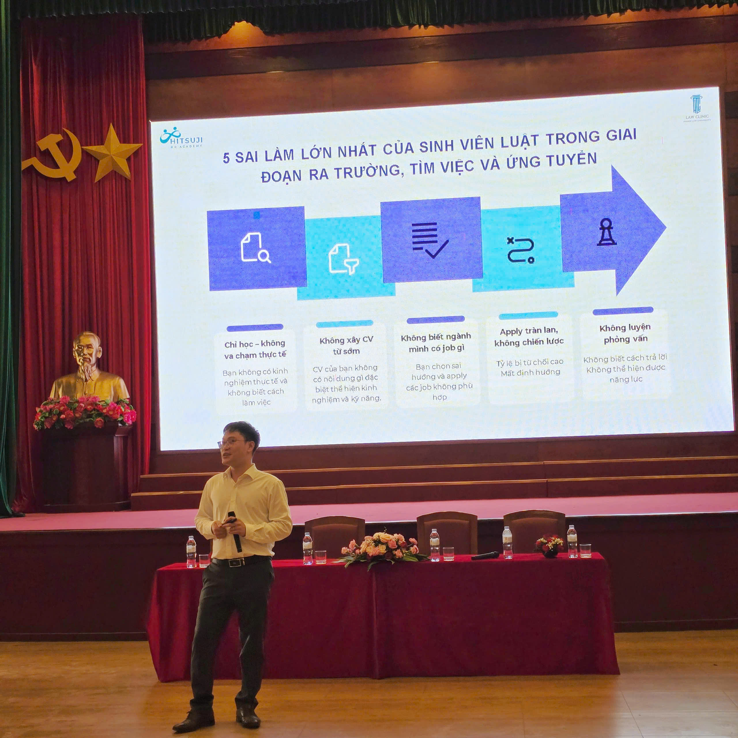 Chiều ngày 16/04/2026, tại Hội trường A403 - Trường Đại học Luật Hà Nội, buổi Workshop đã diễn ra thành công rực rỡ với sự tham gia nhiệt tình của đông đảo các bạn sinh viên. Không chỉ là một buổi chia sẻ kiến thức, Workshop còn giúp các bạn sinh viên Luật định hình rõ ràng hơn con đường sự nghiệp sau khi rời ghế nhà trường.