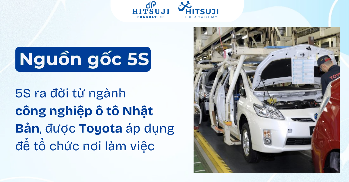 Theo LeanProduction.com - nền tảng quốc tế chuyên nghiên cứu Lean, 5S ra đời từ ngành công nghiệp ô tô Nhật Bản, được Toyota áp dụng để tổ chức nơi làm việc một cách trực quan, khoa học và bền vững. Bài báo về Lịch sử 5S của trang báo này viết rằng “Quy trình năm bước này đã lan toả ra toàn cầu, trở thành nền tảng định hình khái niệm Lean Manufacturing - sản xuất tinh gọn.” Từ đó, 5S không chỉ là một kỹ thuật, mà là một triết lý sống và làm việc kiểu Nhật, giúp mỗi cá nhân rèn luyện sự tự giác, tôn trọng không gian và nâng cao hiệu suất tập thể.