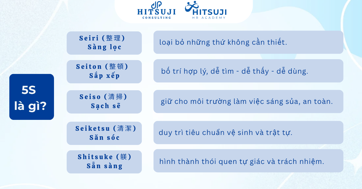 Không chỉ là một phương pháp dọn dẹp nhà xưởng, 5S (ごエス) chính là nền văn hoá vận hành thầm lặng đã góp phần đưa Toyota từ một xưởng dệt nhỏ trở thành biểu tượng toàn cầu của năng suất và chất lượng. Ngày nay, từ các nhà máy ô tô tại Nagoya đến văn phòng mỹ phẩm Shiseido tại Tokyo, tinh thần 5S vẫn là “DNA” của sự chỉn chu, gọn gàng và tôn trọng trong công việc.Cùng Hitsuji Hr Academy tìm hiểu về tinh thần 5S cũng như sự áp dụng của 5S trong thời đại công nghệ số ngày nay!