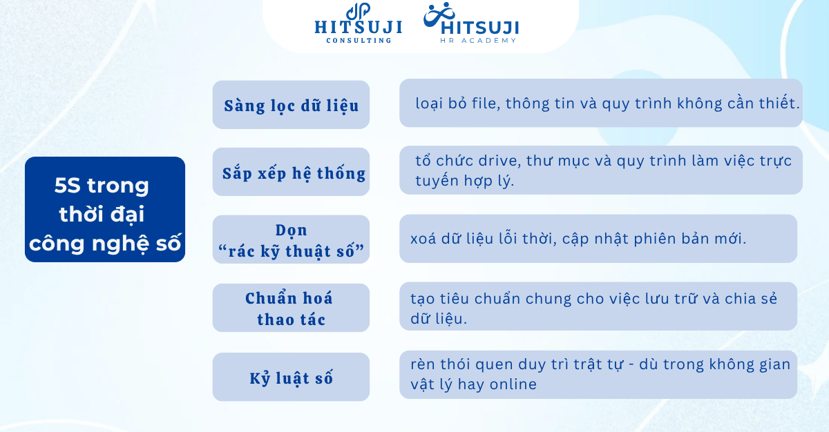 Trong thế giới số, tinh thần 5S không mất đi - mà tiến hóa để thích nghi với thời đại. Doanh nghiệp hiện đại có thể áp dụng 5S không chỉ cho không gian vật lý, mà còn cho không gian kỹ thuật số: