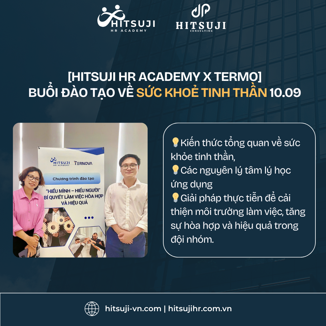 Từ những kinh nghiệm giảng dạy thực tế như tại TERMO, HITSUJI Hr Academy mong muốn lan tỏa giá trị này rộng rãi hơn tới cộng đồng HR và quản lý. Bởi sức khỏe tinh thần không chỉ là vấn đề riêng của mỗi cá nhân, mà là một chỉ số quan trọng trong quản trị nhân sự hiện đại. Chúng tôi trân trọng tổ chức: