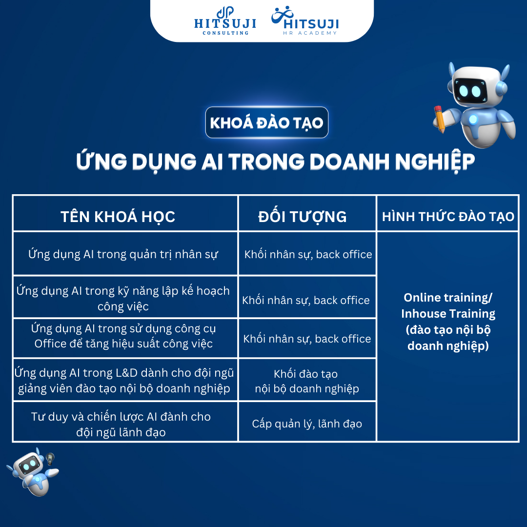 🔥 Và đây mới chỉ là bước khởi đầu! Tháng 10 tới, Hitsuji HR Academy tiếp tục triển khai chuỗi KHÓA ĐÀO TẠO ỨNG DỤNG AI TRONG DOANH NGHIỆP nhằm giúp HR, quản lý và lãnh đạo: