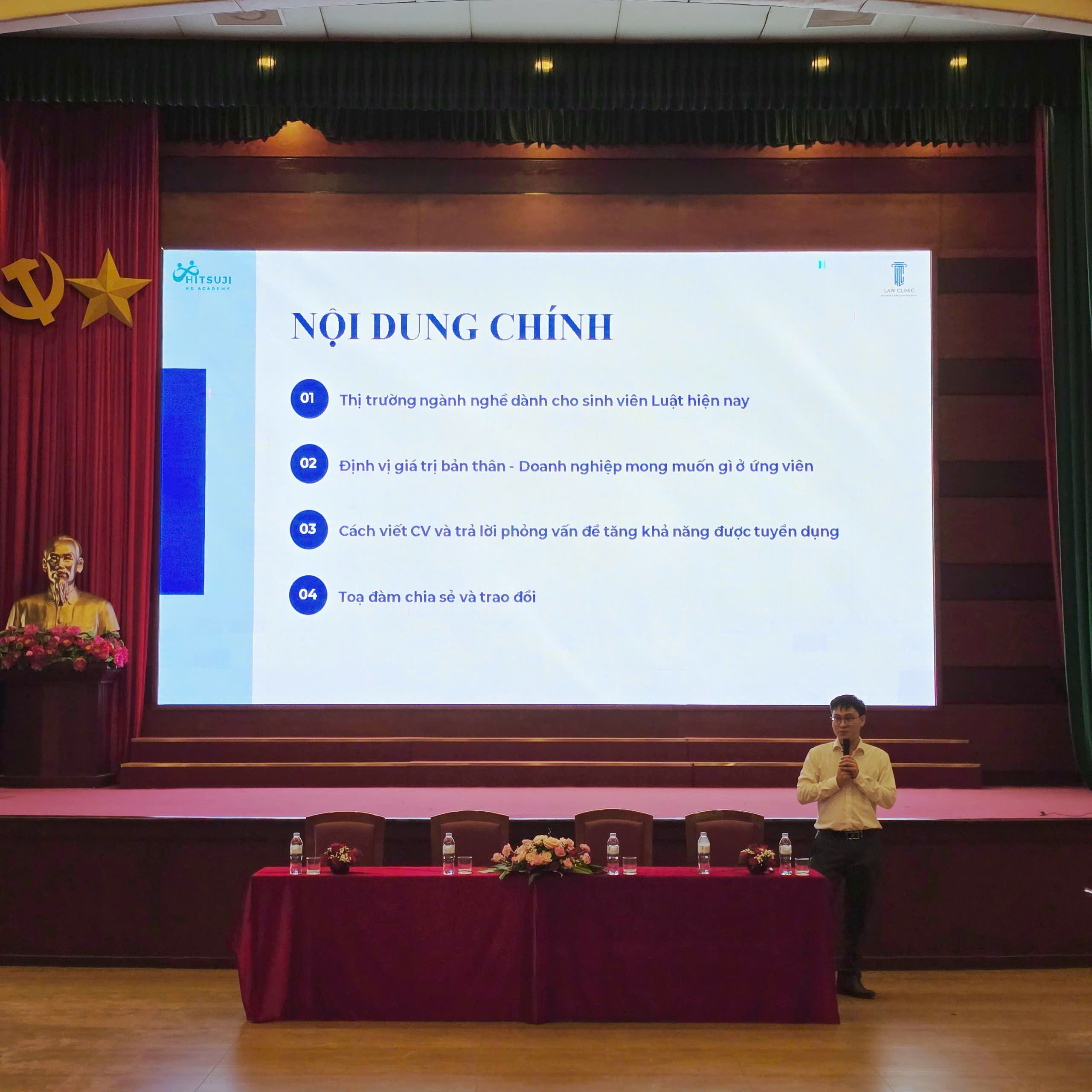 Chiều ngày 16/04/2026, tại Hội trường A403 - Trường Đại học Luật Hà Nội, buổi Workshop đã diễn ra thành công rực rỡ với sự tham gia nhiệt tình của đông đảo các bạn sinh viên. Không chỉ là một buổi chia sẻ kiến thức, Workshop còn giúp các bạn sinh viên Luật định hình rõ ràng hơn con đường sự nghiệp sau khi rời ghế nhà trường.